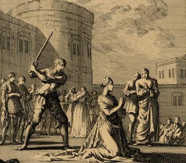 We have depicted the scene showing Anne being beheaded (in London) and Mary appearing to Rich as a ghost at Rochford Hall, perhaps calling him ‘Murderer!’ for gathering ‘evidence’ that led to Anne’s downfall.