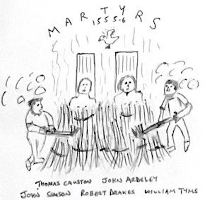 Thomas Causton (from Thundersley) and John Ardeley (from Great Wigborough) were burnt at Rayleigh. Ardeley’s compatriot, John Simson, was burnt at Rochford. William Tyms (from Hockley) and Robert Drake(s) (from Thundersley) were both burnt at Smithfield in London. Memorials to these martyrs are found off Rochford Square and in Rayleigh High Street. Rochford district was a hotbed of Protestantism and these burnings probably took place in its two largest towns to deter others from following that faith.